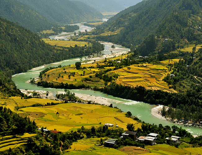 確實如此。車子拐過一個彎。我看見暖色的陽光打在龐大的白色建筑上,反射出溫暖又華麗的色調,冷沁的冰川融水從這里緩緩而過,釋放著生命流動的氣息,普納卡宗就這樣安祥地依偎在蔥綠的森林之中,在珍稀高山植物的掩映下,越發顯得古典優雅。