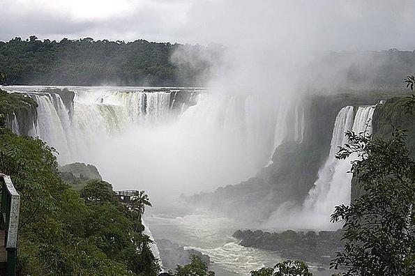 維多利亞瀑布大一些。懸崖邊有無數樹木叢生的巖石島嶼,使得伊瓜蘇河由此跌落是分為急流和泄瀑,高度不等,春冬季節瀑布流量較大,夏末和秋天流量較少,伊瓜蘇瀑布被列為世界文化遺產。發源于巴西境內的伊瓜蘇河在匯入巴拉那河之前,水流漸緩,在