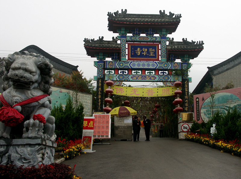 走近景區,放眼望去,古香古色的圣泉山大牌樓矗立于停車場的北面,進了牌樓,便是用鐵管鋼筋搭起的千米長廊。