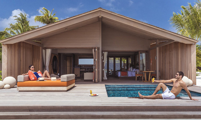 別墅可以俯瞰碧綠的瀉湖和馬爾代夫的純白色沙灘。該別墅擁有自己的私人游泳池和露臺,可直接進入瀉湖。傍晚的夕陽將瀉湖照成粉紅色,紅色和琥珀色的色調。