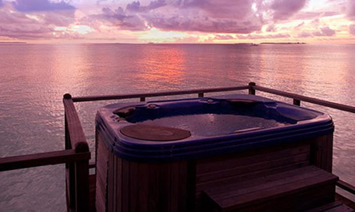 落日余暉在海面上舞動,而天空則變成了紫羅蘭和赭石色的電動調色板。很快星星開始在寧靜的夜空中閃爍,您躺在按摩浴缸的泡泡中,邊啜飲香檳邊俯瞰大海。