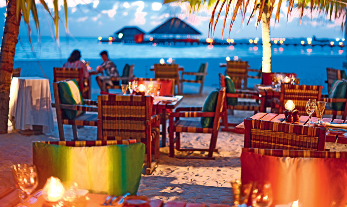 美食特色:歐洲和亞洲美食。餐廳介紹:Thin Rah是肯尼呼拉島的主餐廳,提供早晚餐,通風極好,有折疊式窗戶、茅草蓋的屋頂,室外用餐區可觀賞到主游泳池和瀉湖,自助早餐有多種菜式,煎蛋、薄烤餅和餅干等,每間有超過15種面包或糕點。