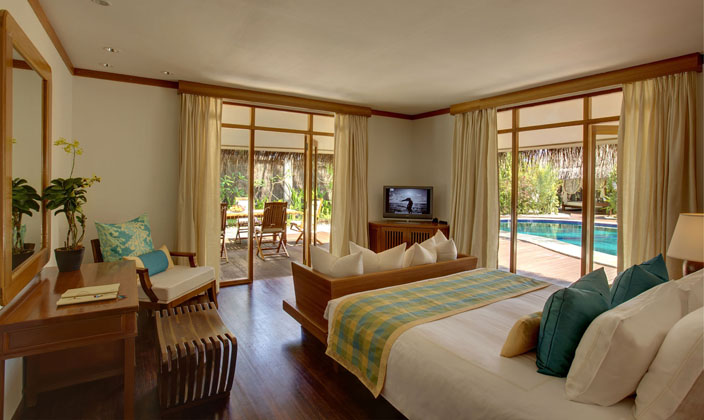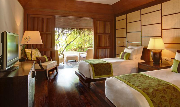 房間設計淳樸自然,提供有獨立的陽臺和私人海濱。水上別墅和豪華別墅是座落在瀉湖之上,提供有獨立的梯子直接下水。所有的客房都可觀賞到印度洋美景,房間密度小。私密性高。