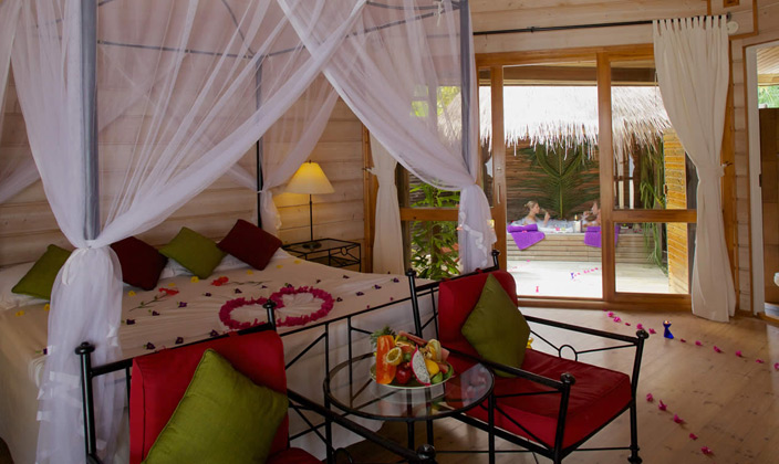 古麗都島度假村四周是彩色的珊瑚礁,綠松石色的水與白沙灘。古麗都島度假村的平房與別墅都處于白沙灘上,日落水上別墅建在瀉湖上。裝著定制的地板與家具,還有浴場與純天然的木材墻壁,讓旅客享受異國情調。島的西邊是特別的酒吧、餐廳與接待處,給游客提供童話般的水上別墅。蜜月游客到達以后,酒店會特別用香檳來歡迎。還會給他們準備豪華的新鮮龍蝦大餐,及私人游艇之旅。蜜月夫婦還可以跟海豚嬉戲,探索豐富多彩的海底世界,或一起欣賞海邊的美麗的日落景色。