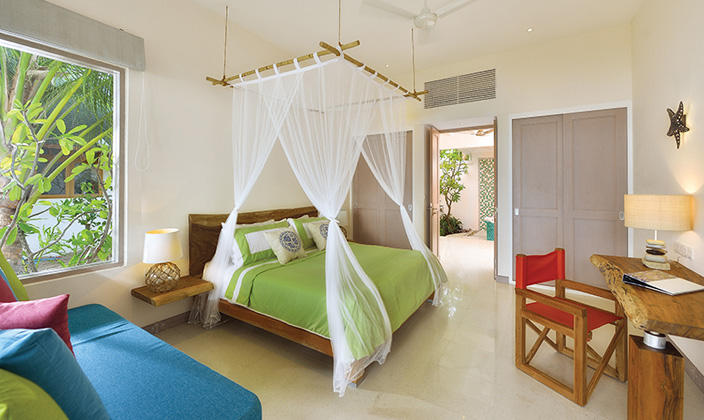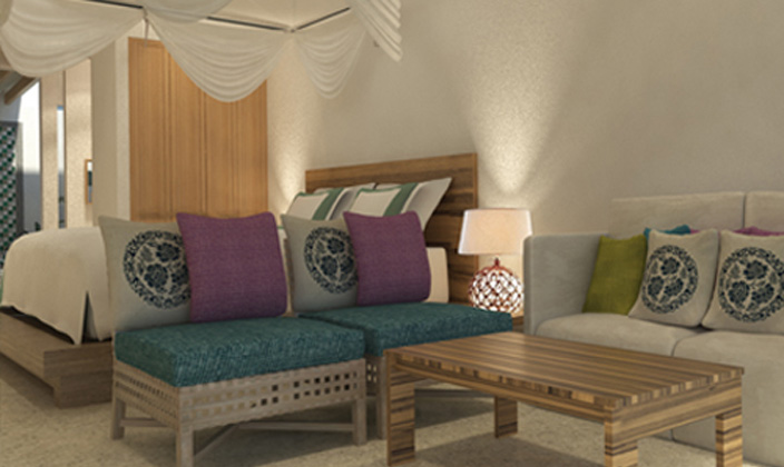 別墅里環繞著青翠的熱帶景致,房間格局錯落有致,裝飾清新簡約,色調豐富多彩。首先看到的是附有沙發的落地窗,里面則是一個帶有吊簾的特大床。雖然沙灘別墅是入門級別的房型,但是設計師巧妙的精心安排,一定能讓您得到最舒適的享受。