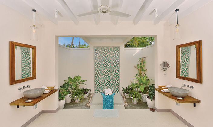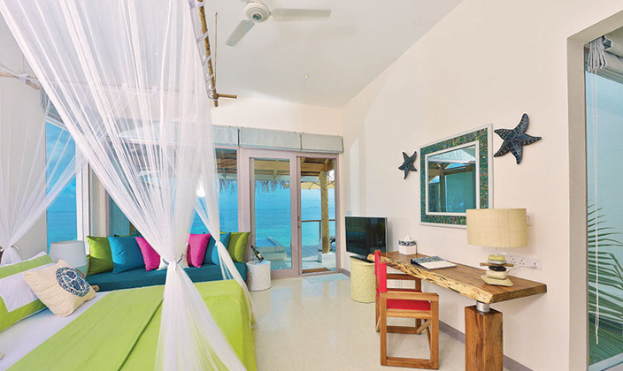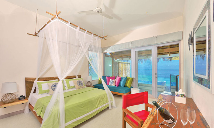 島上唯一一個半沙半水形式的瀉湖別墅,溫馨的自然色調修飾著各種現代化設施,個人的家庭影院系統為您提供一首首輕柔而浪漫的歌曲,大型的落地窗提供180度的震撼海景。戶外的甲板上還有一個私人無邊泳池,夕陽照耀在泳池上,配上漫天的繁星,猶如一副“人間仙境”。