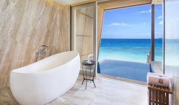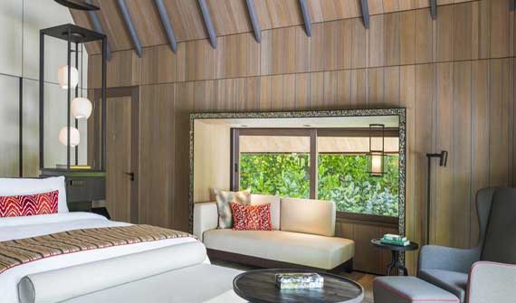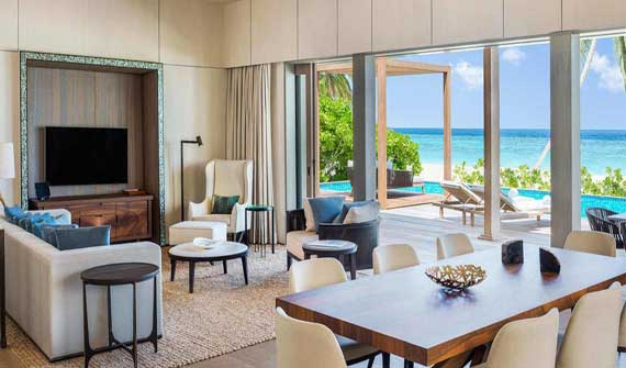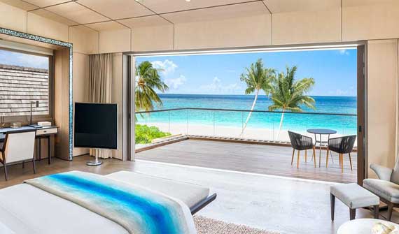 沃木里瑞吉島的定位應該是和W寧靜島同一個級別,甚至更高!所有的房間都是純實木為主,時尚元素為輔的設計風格,給人一種成穩而又奢華的感覺。當然價格也不便宜,目前來看是比寧靜島還要貴,但是不知道開業的時候是否有更好的優惠活動。房間的布局也是相當贊,所有的大床都面朝大海,室內與戶外由巨大的落地窗分隔,外面有一個大型的無邊泳池,直接在房間里就可以欣賞絕佳的海景。