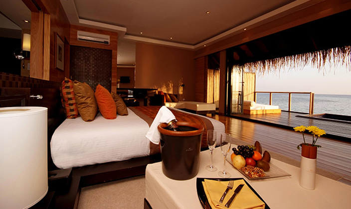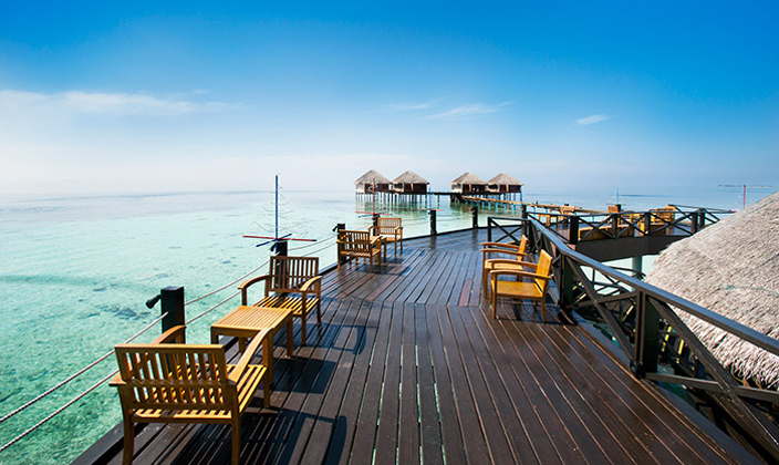瓦度島是第一個將水上屋的概念引進馬代的酒店,島上全是水屋,日式,法式風格。含了三餐,性價比較高,有細白的尾沙灘。