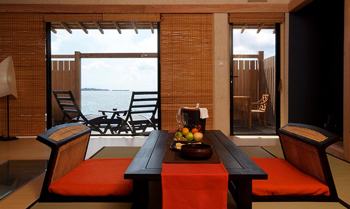 水上日式別墅以傳統日本建筑為設計理念,以追求奢華、隱秘住所的賓客需求為標準精心構建而成。室內裝潢的色調能夠舒緩情緒,美觀宜人,家具的位置經過精心擺設,散發出原汁原味的日本情調。滑入一件色澤鮮艷的和服,想像自己穿越到了古代日本居住沖繩海岸的傳統民家。擁有寬敞走廊的日式別墅棲于瓦度島綠松石般的水域上。