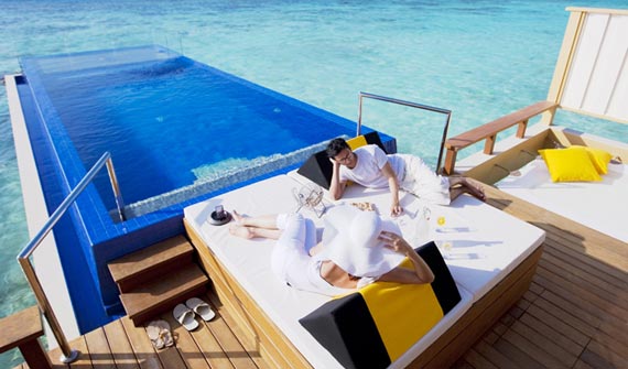 在陽光明媚的水域上享受曼妙時光。 探索修建在水中高柱之上的雙層別墅,在無邊泳池中暢游,慵懶地躺在海上吊床上沐浴日光,或在屋頂涼亭內享受 Spa 護理,您可隨心選擇鐘愛之事。 陽光透過一排玻璃墻和玻璃門從各個角度射入別墅內,絢麗多彩的內飾家具為神奇的海島水上生活注入活力氣息。