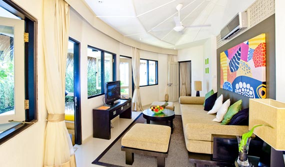 在您的別墅后院中打造一處舒適的角落,更有專享泳池和按摩浴缸等您前來體驗。 別墅內部裝飾采用對比強烈的濃艷色彩,為您的別墅內馬爾代夫體驗注入歡樂與活力。 臥室角落處設有一張沙發床,您可以在窗下安坐或愜意地做個美夢,獨立的起居區采用多種對比鮮明的顏色裝飾,明亮絢爛,兩側環繞著玻璃大窗。