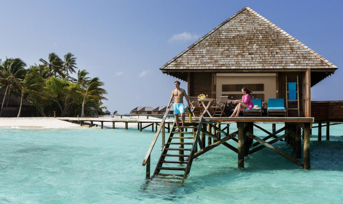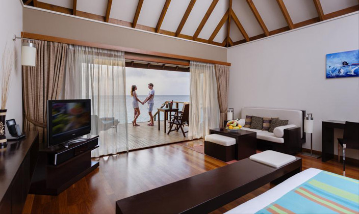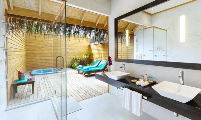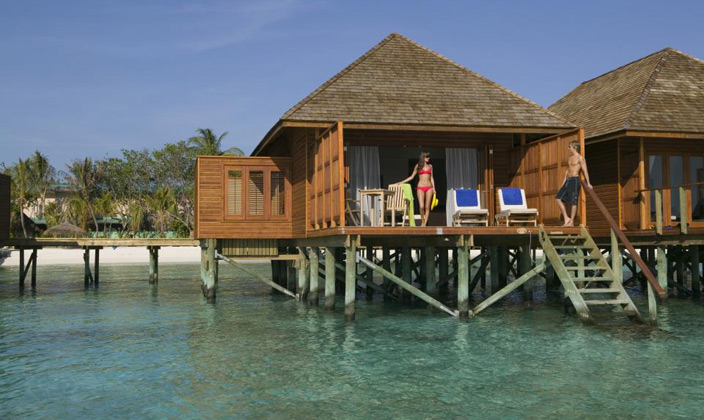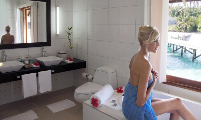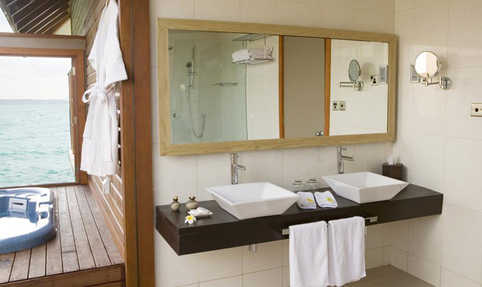 坐落在維利甘度島沙灘對面的瀉湖之上,在這里你可以直接感受到大海的無窮魅力。有個半露天的靠窗浴缸,露臺上有直接下海的樓梯(這個就是water villa露天的浴缸,和Jecuzzi的區別.)。房內設施齊全,裝潢得體,給人一種無窮的舒適感。