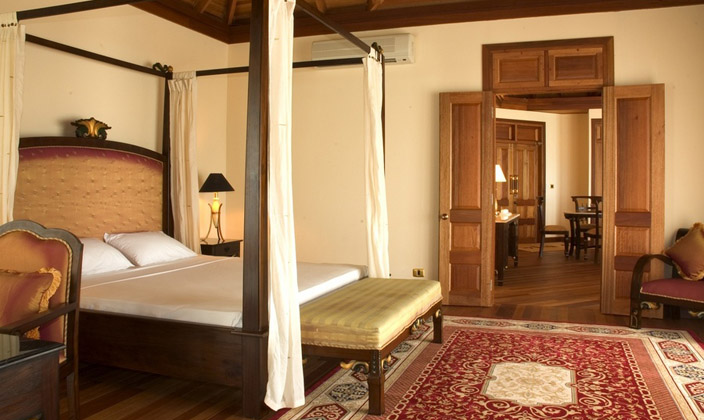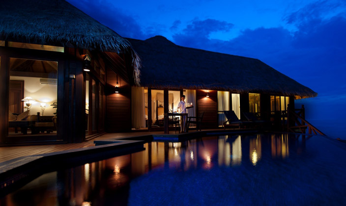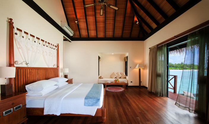 總統水上屋位于水上的2座木橋連接處的頂端,提供完全的私密休閑,水天連線,仿佛造訪了天堂的國度。屋內設計結合歐式風與傳統馬爾地夫的裝飾,古典的雅致中帶上了自然南亞風格,是奢華也是崇尚自然。 您可請專人為全家人準備餐食。