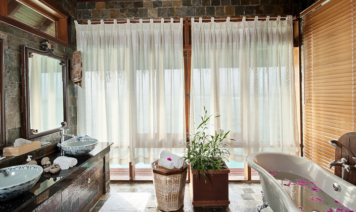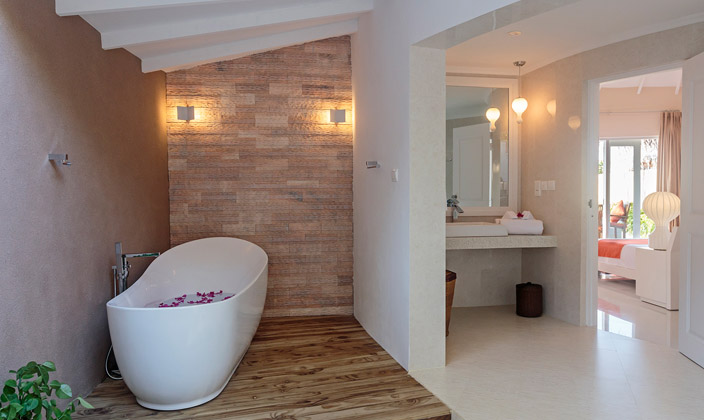 坐落在郁郁蔥蔥的植被之中,每個別墅擁有全景海景,可以俯瞰如畫海灘和瀉湖的風景。全白色的室內裝飾上了柔軟的熱帶色彩主題。橙色和粉紅色的閨房風格沙一點神秘和浪漫。