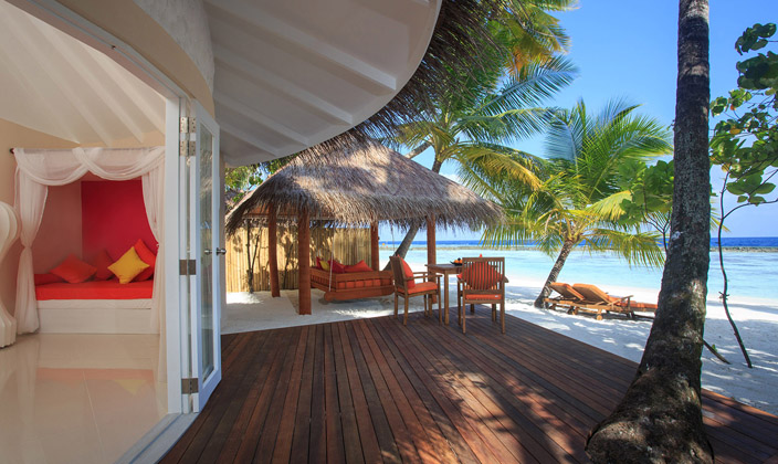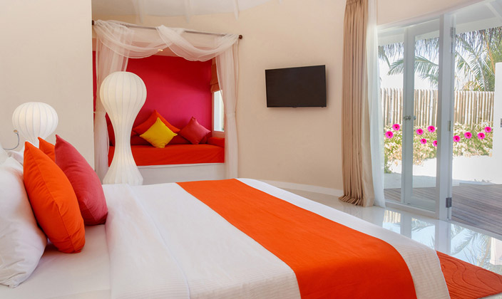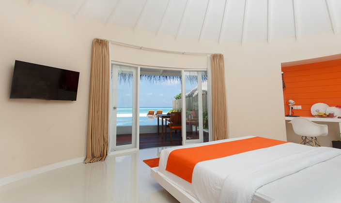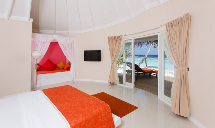 這個是一個新房型,從2015年2月開始出售,房間比之前的沙屋更大,全白色的室內裝飾上了柔軟的熱帶色彩主題。橙色和粉紅色為房間的主要風格,增加了一點神秘和浪漫。全玻璃的推門,有私人陽臺俯瞰海灘,出門就是瀉湖沙灘。