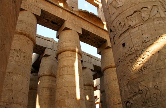 位于底比斯遺址上的阿蒙神廟修建于三千多年前,經(jīng)歷了多次增建。神廟有十重巍峨的門樓和三座雄偉的大殿,廟內(nèi)最為壯觀的建筑就是一座密林似的柱廳,這里豎立著縱橫排列整齊的134根參天巨柱。石柱和殿堂的墻壁上滿是生動精致的浮雕和色彩鮮艷的彩繪,記載著神和人的故事。廟內(nèi)還珍藏有聞名遐邇的方尖碑和多位法老后妃的塑像。