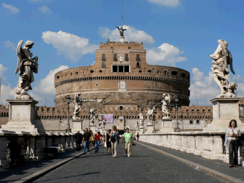 圣天使城堡建于139年,城堡上圓下方,外圍城墻則是五角星形,造型偉岸堅固,仿佛任何力量都無法摧毀。實際上在近2000年歲月中城堡經歷了多次破壞和修復,與初建時已經有了很大差異。現在城堡內部是一所博物館,展示教皇寢宮、歷代兵器等。