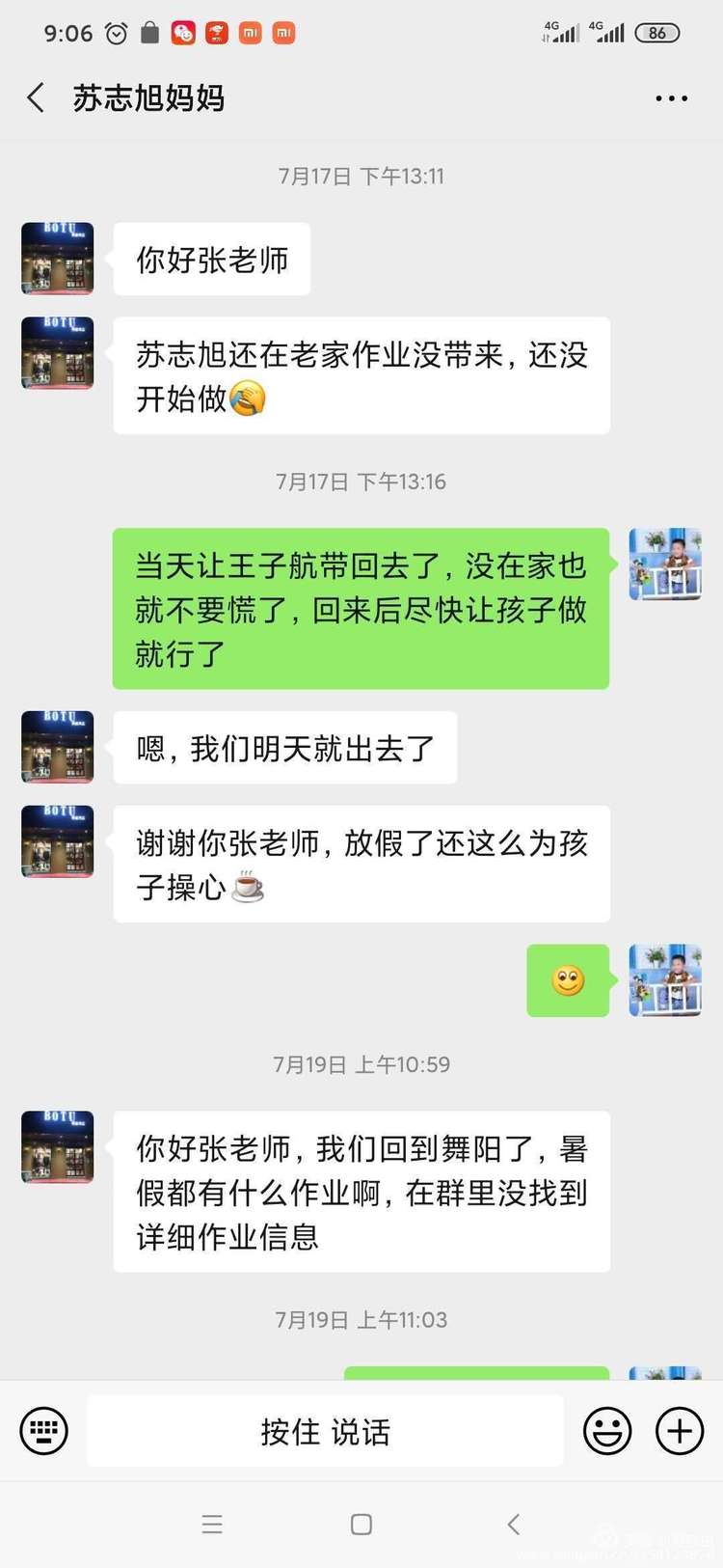 假期已過半,班主任對孩子們進行了家訪,就孩子在家學習及行為習慣的表現詢問家長,家長反饋給班主任,進行溝通交流,很多家長對班主任在假期期間的家訪很感動,紛紛贊揚!