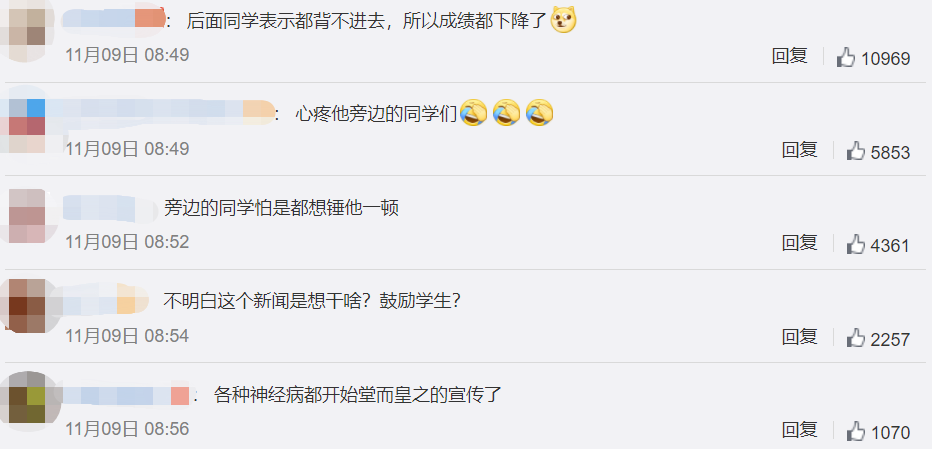前幾天,一個高三男生晨讀的視頻引起了廣大網友的熱議!從視頻中可見,這位坐在第一排的男生,晨讀時用盡全力喊出來的樣子非常用力,連額頭都滲出了明亮的汗水,依然沒有阻擋他津津有味,用力至深的朗讀。晨讀雖然看起來很傻,但不可否認是最好的記憶方法之一,我讀書時也是靠晨讀才記下了很多古文,至今未忘。努力當然有用,我就是努力從偏遠山區到北京安家的,努力有時候看起來偏執,但我們無怨無悔,努力的我們是幸福的。“為了背書而背書,有效果嗎?千萬別是“一頓操作猛如虎,試卷下來二十五”。對此,該同學的班主任回應說:“這個孩子從班上基礎比較差到現在穩居班上前三,未來考一本妥妥的,努力還是有用的。”原本是學生好學,老師鼓勵的畫風,卻也擋不住一些網友的吐槽:對此,有的網友回復說:請不要挖苦每一個努力的孩子!沒有經歷過當下的高三,根本不會理解想拼的孩子的那種真拼!