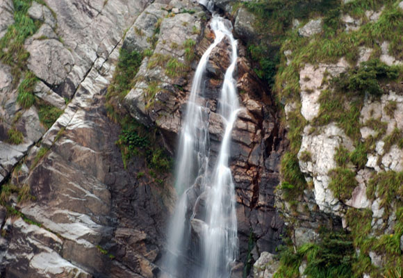 日照香爐生紫煙,遙看瀑布掛前川,飛流直下三千尺,疑是銀河落九天”正是描寫這里的瀑布。朋友們擠到瀑布附近拍照留念,不小心水會濺到身上、照相機上,惹得大家一陣哄笑。三疊泉因為分了三疊得名,一疊傾瀉而下直入潭中,二疊彎彎曲曲,三疊水流噴涌,若是趕上春末夏初多雨之季,泉水聲如龍騰虎嘯聲震四方。