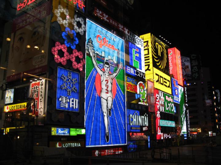 大阪的劇場聚集區。現如今,五彩繽紛的霓虹燈和閃動的字幕更增添了這里的活力。