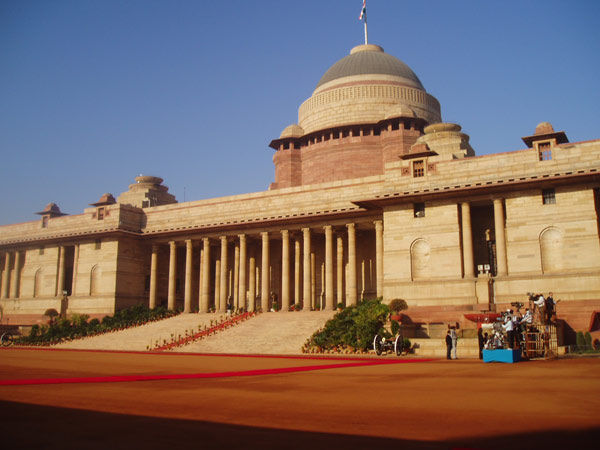 總統府建于1929年,原名維多利亞宮,印度獨立后,改為總統府。總統府是一座氣勢雄宏的宮殿式建筑,融合了莫臥兒王朝和西方建筑的風格,有覲見廳、宴會廳、圖書館等華麗的廳堂,還有無數噴泉水池、亭榭長廊。小山東北的議會大廈和王子公園里的印度門,也都是壯麗的建筑。